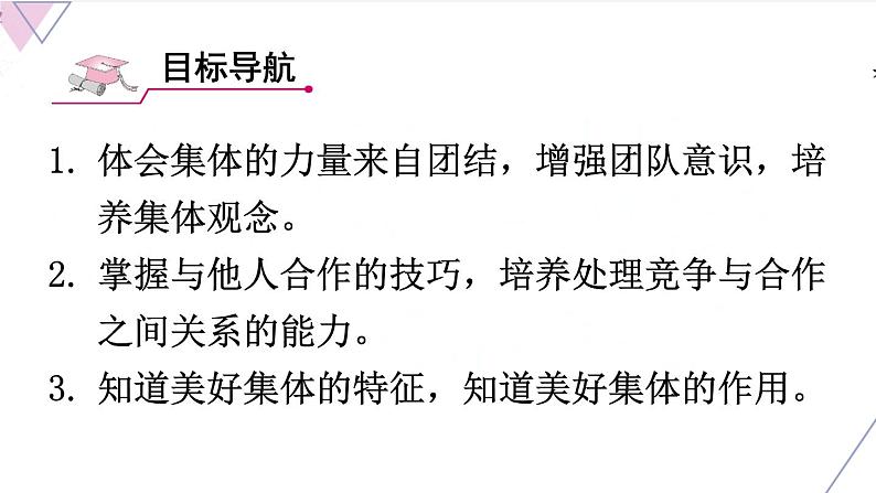 体会集体的力量来自团结,增强团队意识,培养集体观念。掌握与他人合作的技巧,培养处理竞争与合作之间关系的能力。知道美好集体的特征,知道美好集体的作用。