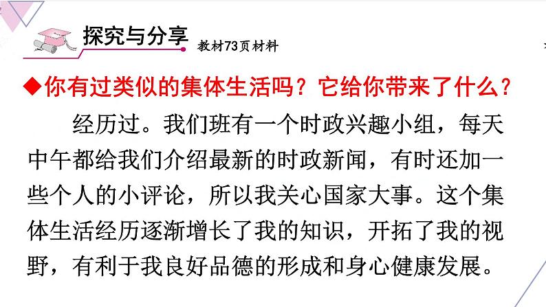 存在。集体成员之间的和而不同、相互激励和竞争是集体发展的动力,也是集体活力的重要表现。在集体生活中,竞争是以承认、尊重为前提的,集体成员之间交流互鉴,合作学习,共同提高。