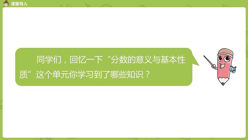 这是一份数学四 分数的意义和性质教学ppt课件,共18页。PPT课件主要包含了学习目标,我知道了分数的意义,整体回顾,分数的意义和性质,分数的意义,分数的基本性质,分数的意义和分数单位,分数与除法的关系,真分数与假分数,分数的大小比较等内容,欢迎下载使用。