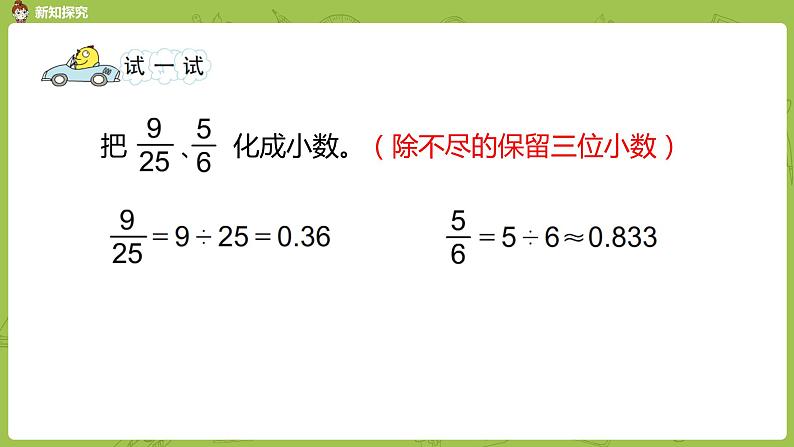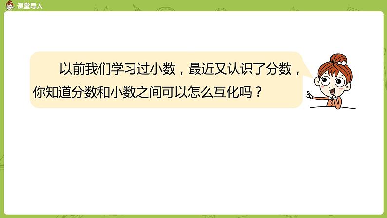 1.理解和掌握分数化成小数、小数化成分数的方法,能运用小数与分数的互化解决有关的简单实际问题。2.经历探索分数与小数互化的过程,能说明思考方法,体会方法的多样,培养分析、推理、归纳等思维能力和思维的灵活性,进一步发展数感。3.体会分数与小数互化在日常生活中的应用,获得探索成功的感受,增强学好数学的信心。