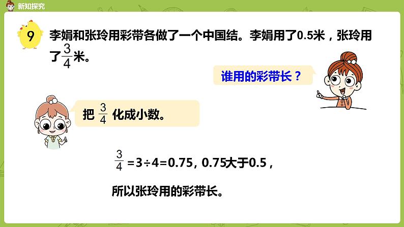 =3÷4=0.75,0.75大于0.5, 所以张玲用的彩带长。