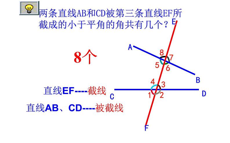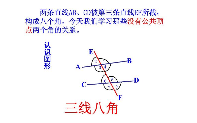 两条直线AB、CD被第三条直线EF所截,构成八个角,今天我们学习那些没有公共顶点两个角的关系。