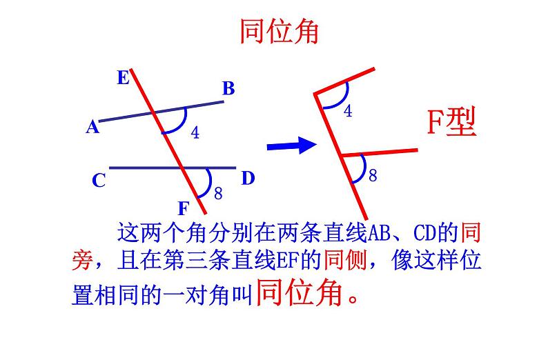 这两个角分别在两条直线AB、CD的同旁,且在第三条直线EF的同侧,像这样位置相同的一对角叫同位角。