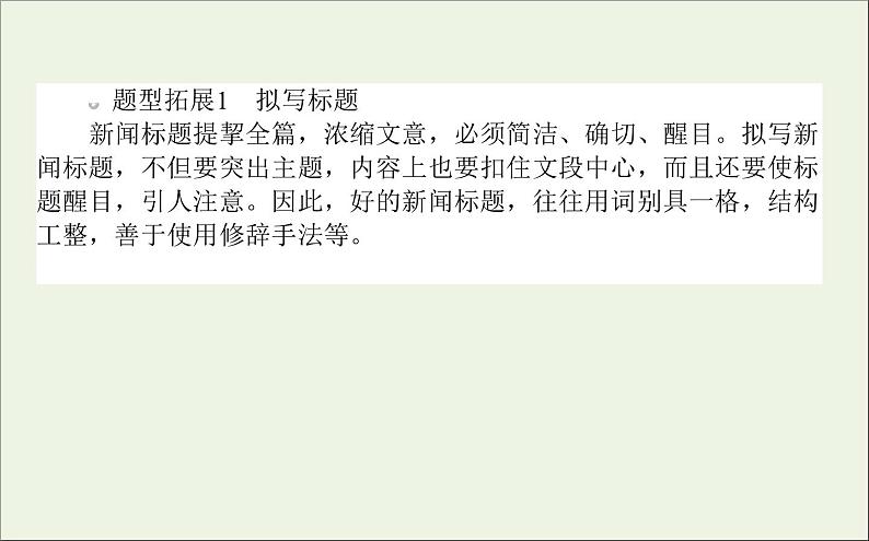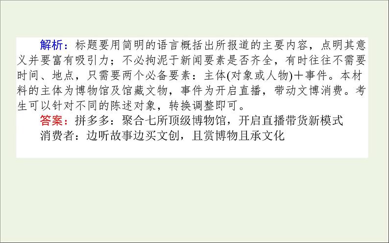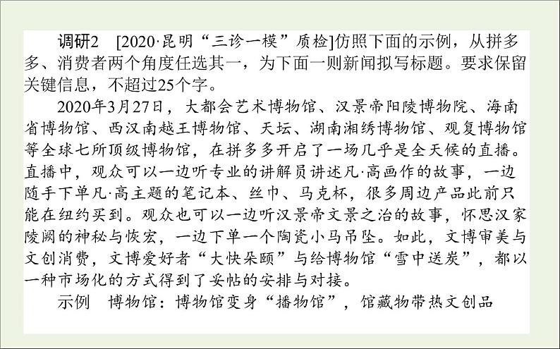 2023届高考语文复习:压缩语段下定义、新闻类压缩 课件: 这是一份2023届高考语文复习:压缩语段下定义、新闻类压缩 课件,共41页。PPT课件主要包含了题型一下定义,考法1拟写一句话新闻,方法突破,考法3拟写新闻导语等内容,欢迎下载使用。