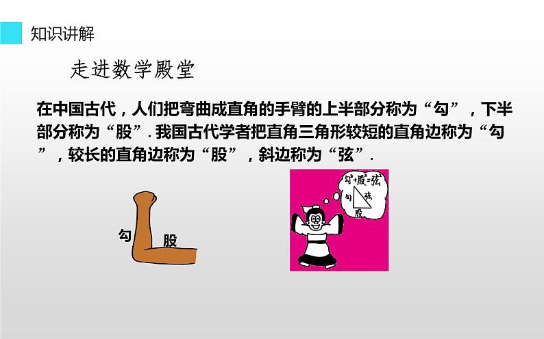 在中国古代,人们把弯曲成直角的手臂的上半部分称为“勾”,下半部分称为“股”.我国古代学者把直角三角形较短的直角边称为“勾”,较长的直角边称为“股”,斜边称为“弦”.