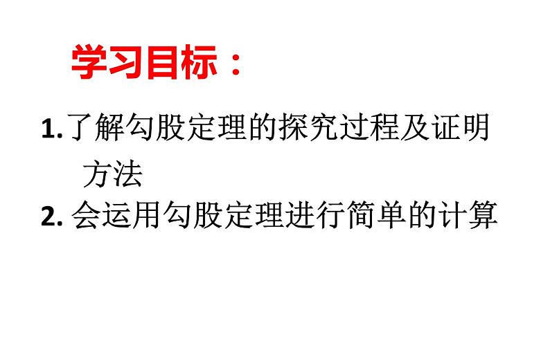 展开1.了解勾股定理的探究过程及证明 方法 2. 会运用勾股定理进行简单的计算