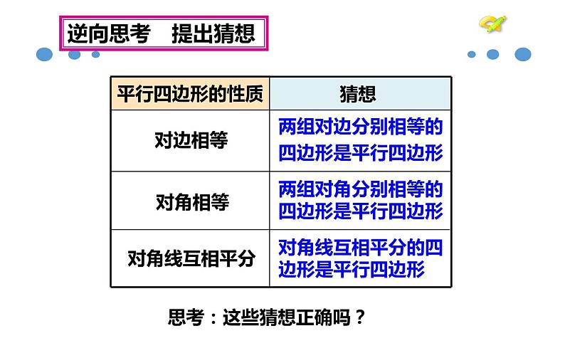 问题3 平行四边形上面的三条性质的逆命题各是什么?