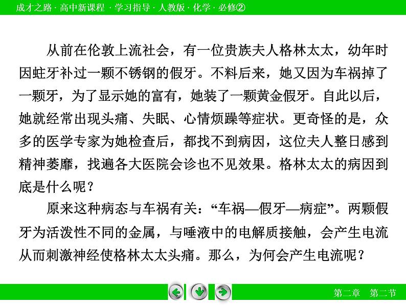 从前在伦敦上流社会,有一位贵族夫人格林太太,幼年时因蛀牙补过一颗不锈钢的假牙。不料后来,她又因为车祸掉了一颗牙,为了显示她的富有,她装了一颗黄金假牙。自此以后,她就经常出现头痛、失眠、心情烦躁等症状。更奇怪的是,众多的医学专家为她检查后,都找不到病因,这位夫人整日感到精神萎靡,找遍各大医院会诊也不见效果。格林太太的病因到底是什么呢?原来这种病态与车祸有关:“车祸—假牙—病症”。两颗假牙为活泼性不同的金属,与唾液中的电解质接触,会产生电流从而刺激神经使格林太太头痛。那么,为何会产生电流呢?
