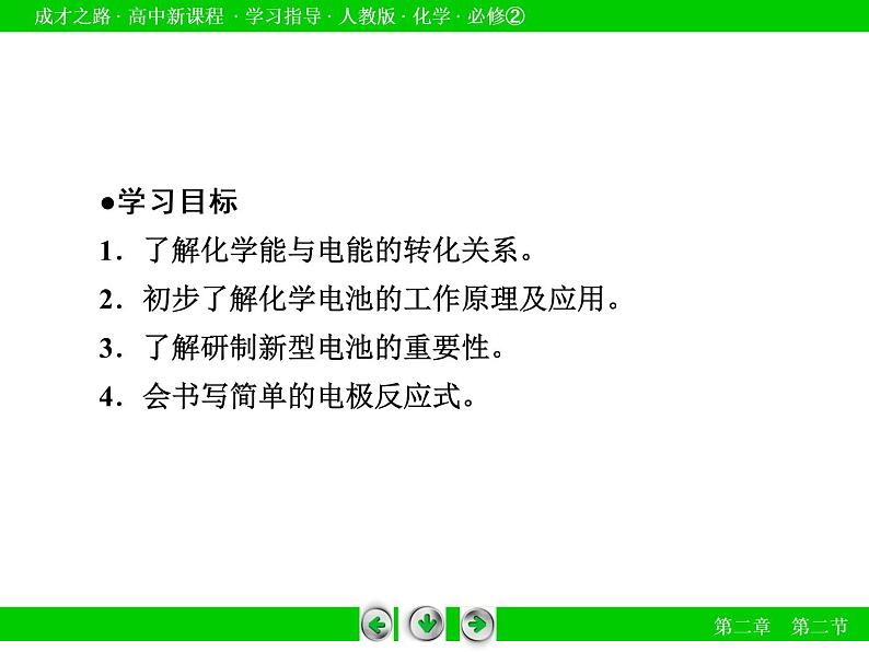 ●学习目标1.了解化学能与电能的转化关系。2.初步了解化学电池的工作原理及应用。3.了解研制新型电池的重要性。4.会书写简单的电极反应式。