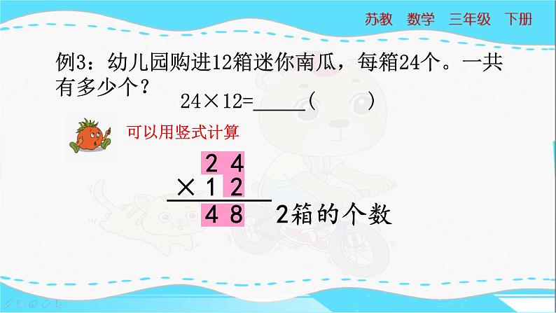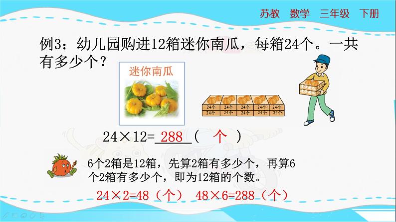 例3:幼儿园购进12箱迷你南瓜,每箱24个。一共有多少个?