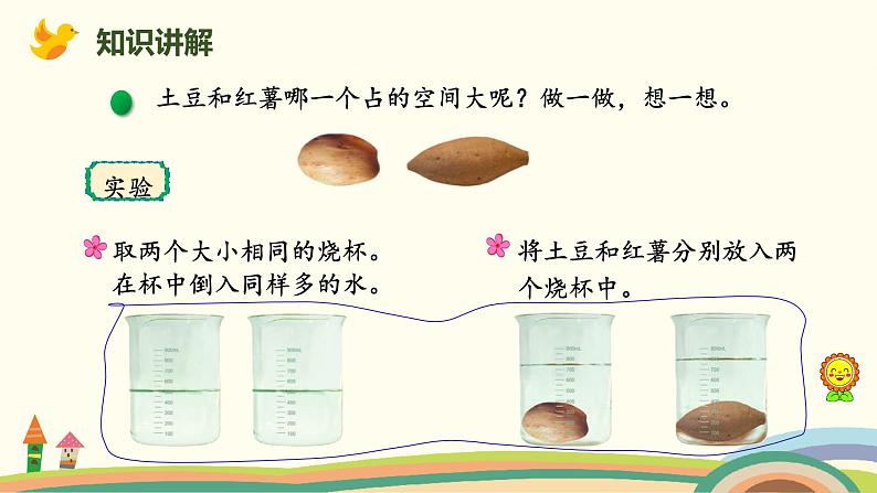 土豆和红薯哪一个占的空间大呢?做一做,想一想。