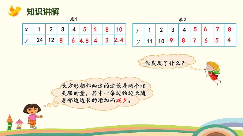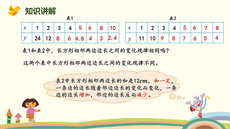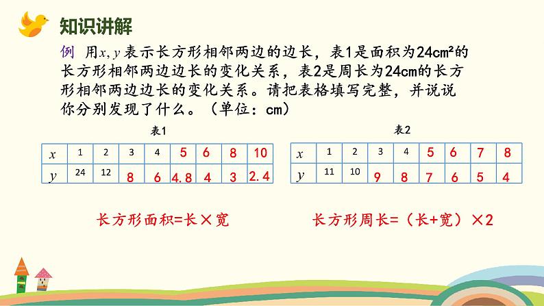 例 用 表示长方形相邻两边的边长,表1是面积为24cm²的长方形相邻两边边长的变化关系,表2是周长为24cm的长方形相邻两边边长的变化关系。请把表格填写完整,并说说你分别发现了什么。(单位:cm)