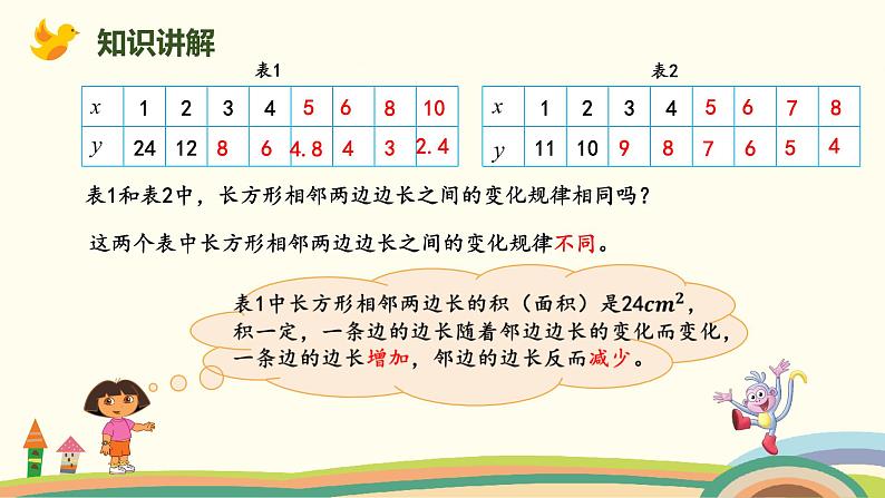 表1和表2中,长方形相邻两边边长之间的变化规律相同吗?