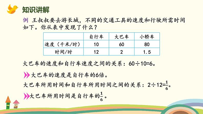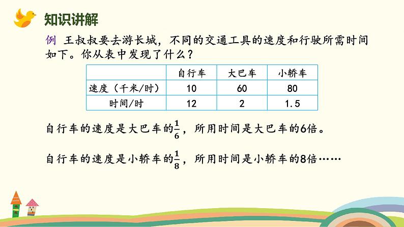 例 王叔叔要去游长城,不同的交通工具的速度和行驶所需时间如下。你从表中发现了什么?