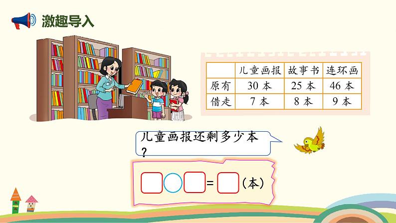 小学数学阅览室多媒体教学课件ppt: 这是一份小学数学阅览室多媒体教学课件ppt,共26页。PPT课件主要包含了复习导入,看谁算得对又快,-4=,-2=,-5=,-8=,-6=,-3=,探究新知,-7=等内容,欢迎下载使用。