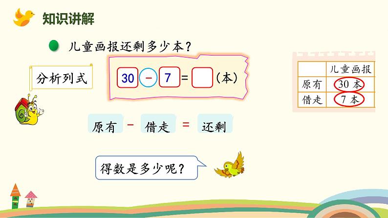 已知原有和借走的数量,求还剩多少,要用原有的数量减去借走的数量。两位数减一位数的退位减法,要相同数位对齐,从个位减起,个位不够减要向十位借1。