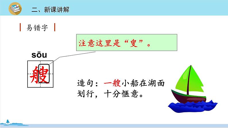 造句:一艘小船在湖面划行,十分惬意。