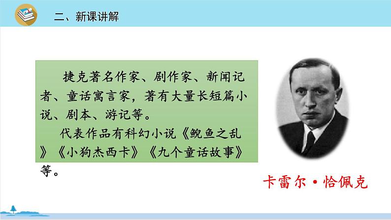 捷克著名作家、剧作家、新闻记者、童话寓言家,著有大量长短篇小说、剧本、游记等。 代表作品有科幻小说《鲵鱼之乱》《小狗杰西卡》《九个童话故事》等。