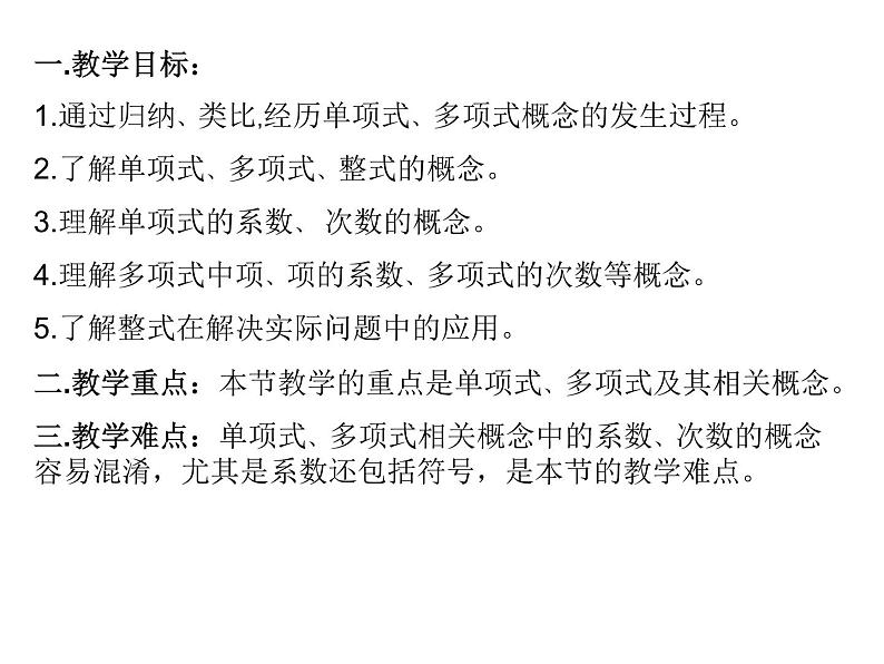 一.教学目标:1.通过归纳、类比,经历单项式、多项式概念的发生过程。2.了解单项式、多项式、整式的概念。3.理解单项式的系数、 次数的概念。4.理解多项式中项、项的系数、多项式的次数等概念。5.了解整式在解决实际问题中的应用。二.教学重点:本节教学的重点是单项式、多项式及其相关概念。三.教学难点:单项式、多项式相关概念中的系数、次数的概念容易混淆,尤其是系数还包括符号,是本节的教学难点。