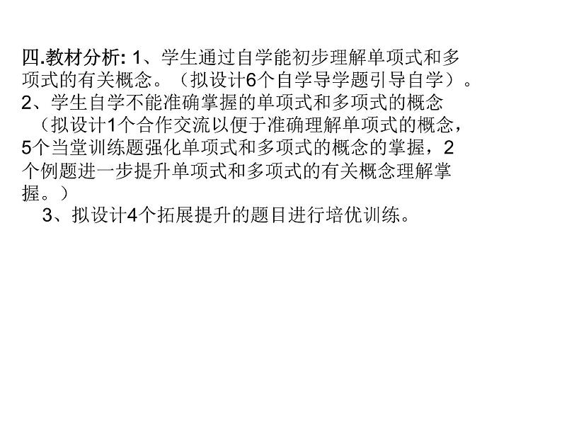 四.教材分析: 1、学生通过自学能初步理解单项式和多项式的有关概念。(拟设计6个自学导学题引导自学)。2、学生自学不能准确掌握的单项式和多项式的概念 (拟设计1个合作交流以便于准确理解单项式的概念,5个当堂训练题强化单项式和多项式的概念的掌握,2个例题进一步提升单项式和多项式的有关概念理解掌握。) 3、拟设计4个拓展提升的题目进行培优训练。