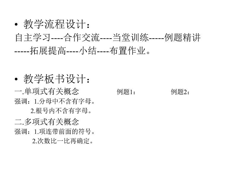 教学流程设计:自主学习----合作交流----当堂训练-----例题精讲-----拓展提高----小结----布置作业。教学板书设计:一.单项式有关概念 例题1: 例题2:强调:1.分母中不含有字母。 2.根号内不含有字母。二.多项式有关概念强调:1.项连带前面的符号。 2.次数比一比再确定。