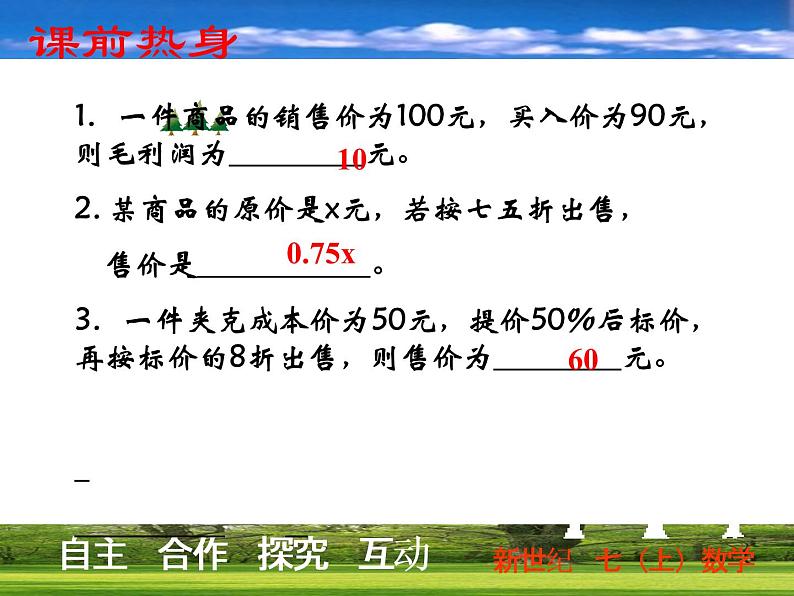 1. 一件商品的销售价为100元,买入价为90元,则毛利润为 元。2. 某商品的原价是x元,若按七五折出售, 售价是 。3. 一件夹克成本价为50元,提价50%后标价,再按标价的8折出售,则售价为 元。