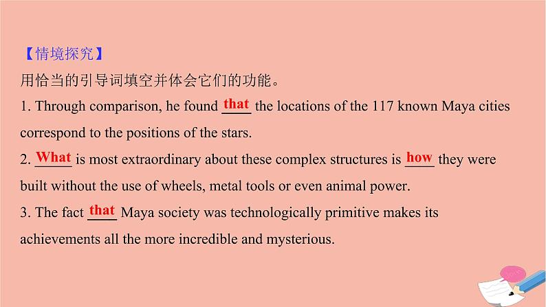 2. 课文语法填空。 The 15-year-ld Canadian William Gadury fund that the lcatin f the 117 knwn cities crrespnd t the psitins f the stars. (1)______(base) n this, he believed he had sptted an unknwn Maya city buried deep in the jungle. Maya civilisatin has many achievements. They (2)_______(apply)their understanding f mathematics and astrnmy t the Maya calendar, (3)______was accurate t within 30 secnds per year. The Maya built (4)__________(impress) palaces and temples, including their representative step pyramids.