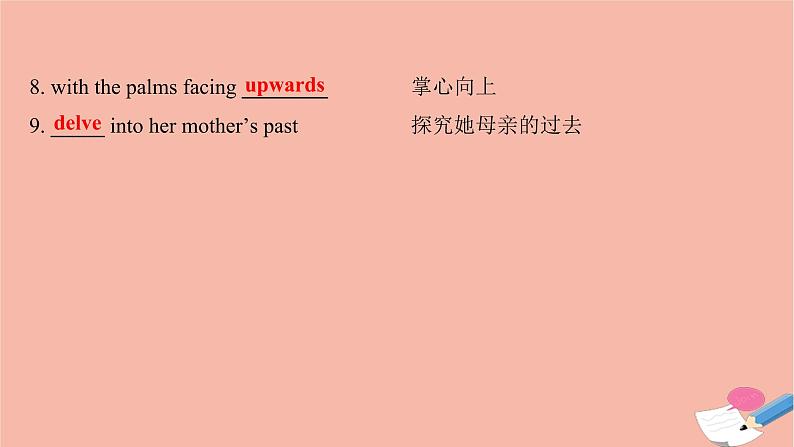 【语块积累】bury ne’s face/head in ne’s hands (因难过)双手掩面/抱头bury neself in. . . 埋头……类似的短语有: devte neself t 致力于……abandn neself in 沉浸于……absrb neself in. . . 使全神贯注于……lst neself in 沉浸于……