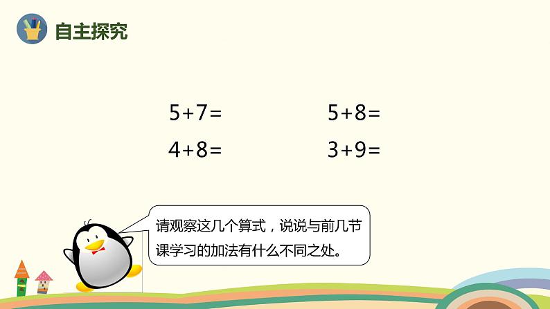 请观察这几个算式,说说与前几节课学习的加法有什么不同之处。