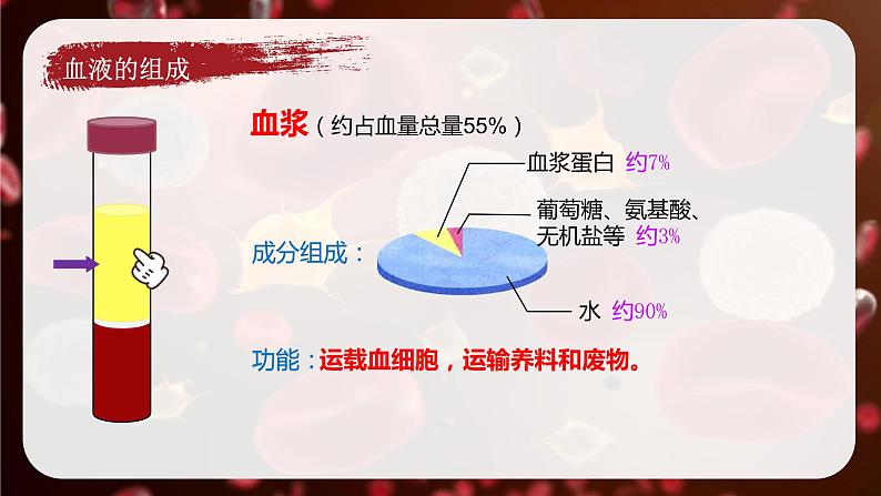 成分:由水、无机盐、葡萄糖、尿素等组成作用:运载血细胞,运输养料和废物