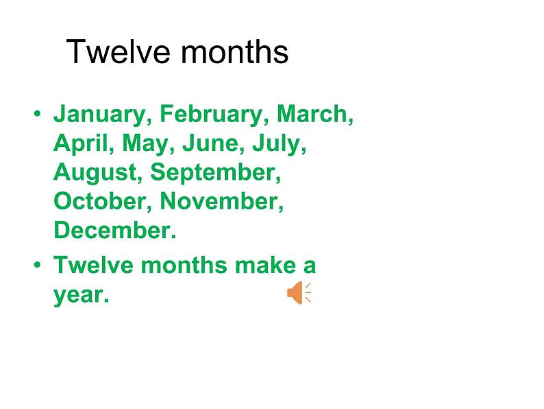 一月January是新年 二月February冬过完三月March是春天 四月April天转暖五月May百花艳 六月June是夏天七月July去海边 八月August暑假完九月September新学年十月Octber百果甜十一月Nvember秋过完十二月December天渐寒