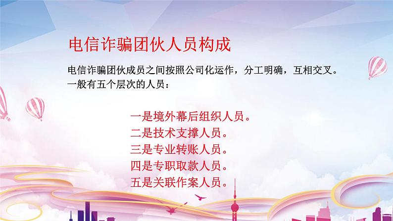 电信诈骗团伙成员之间按照公司化运作,分工明确,互相交叉。一般有五个层次的人员: 一是境外幕后组织人员。 二是技术支撑人员。 三是专业转账人员。 四是专职取款人员。 五是关联作案人员。