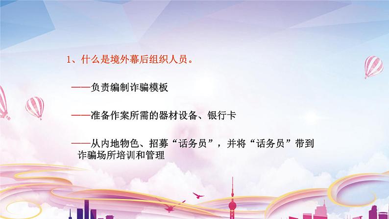 1、什么是境外幕后组织人员。 ——负责编制诈骗模板 ——准备作案所需的器材设备、银行卡 ——从内地物色、招募“话务员”,并将“话务员”带到诈骗场所培训和管理