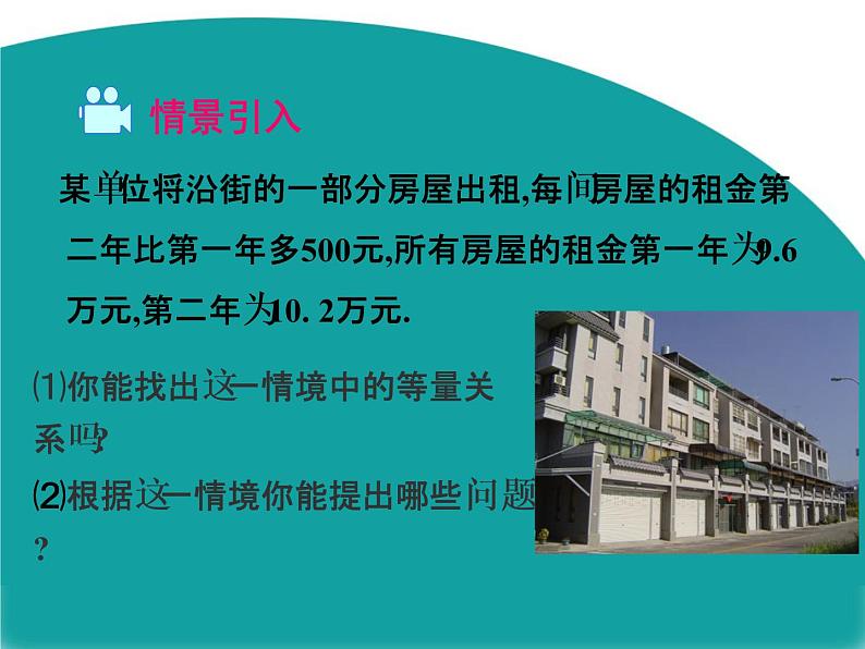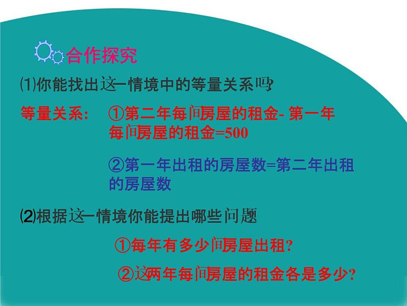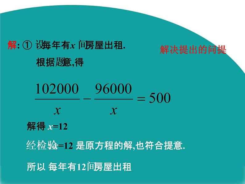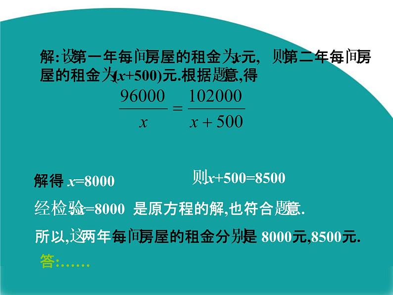 解:设第一年每间房屋的租金为x元, 则第二年每间房屋的租金为(x+500)元.根据题意,得