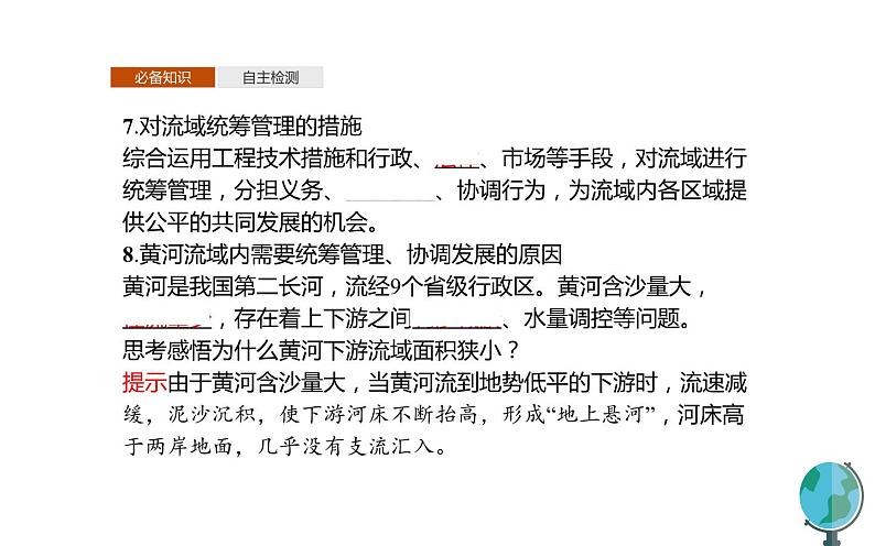 7.对流域统筹管理的措施综合运用工程技术措施和行政、法律、市场等手段,对流域进行统筹管理,分担义务、分享权利、协调行为,为流域内各区域提供公平的共同发展的机会。8.黄河流域内需要统筹管理、协调发展的原因黄河是我国第二长河,流经9个省级行政区。黄河含沙量大,径流量少,存在着上下游之间调沙减淤、水量调控等问题。思考感悟为什么黄河下游流域面积狭小?提示由于黄河含沙量大,当黄河流到地势低平的下游时,流速减缓,泥沙沉积,使下游河床不断抬高,形成“地上悬河”,河床高于两岸地面,几乎没有支流汇入。