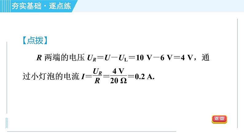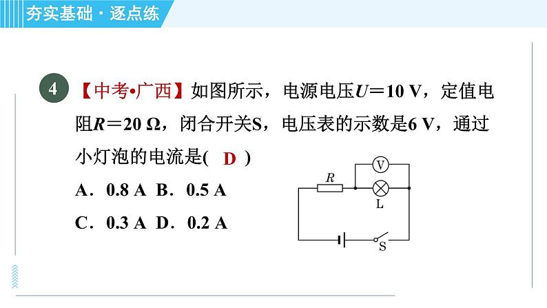 【中考•广西】如图所示,电源电压U=10 V,定值电阻R=20 Ω,闭合开关S,电压表的示数是6 V,通过小灯泡的电流是( )A.0.8 A B.0.5 A C.0.3 A D.0.2 A
