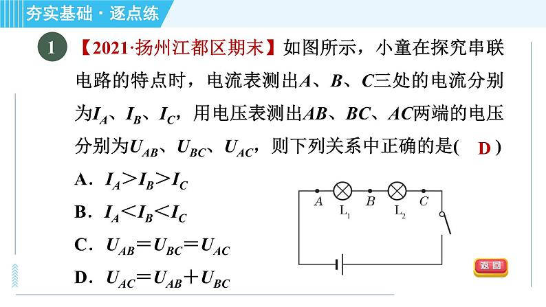 展开【2021·扬州江都区期末】如图所示,小童在探究串联电路的特点时,电流表测出A、B、C三处的电流分别为IA、IB、IC,用电压表测出AB、BC、AC两端的电压分别为UAB、UBC、UAC,则下列关系中正确的是( )A.IA>IB>IC B.IA<IB<ICC.UAB=UBC=UAC D.UAC=UAB+UBC