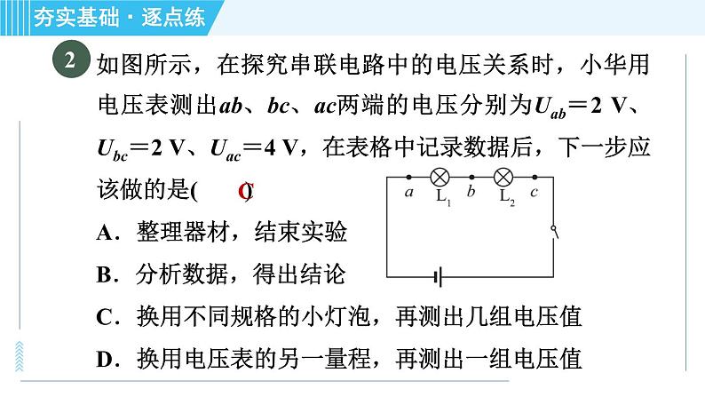 如图所示,在探究串联电路中的电压关系时,小华用电压表测出ab、bc、ac两端的电压分别为Uab=2 V、Ubc=2 V、Uac=4 V,在表格中记录数据后,下一步应该做的是( )A.整理器材,结束实验 B.分析数据,得出结论C.换用不同规格的小灯泡,再测出几组电压值D.换用电压表的另一量程,再测出一组电压值