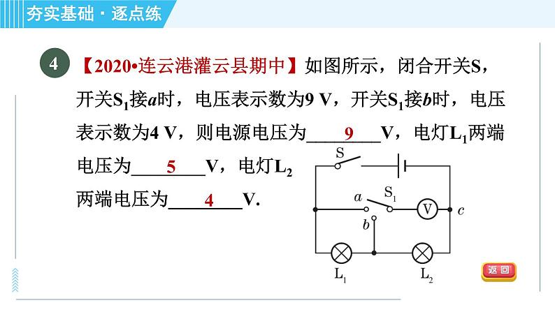 【2020•连云港灌云县期中】如图所示,闭合开关S,开关S1接a时,电压表示数为9 V,开关S1接b时,电压表示数为4 V,则电源电压为________V,电灯L1两端电压为________V,电灯L2两端电压为________V.