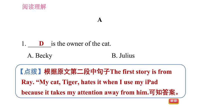 展开A 1. _______is the wner f the cat.A. Becky B. JuliusC. Clin D. Ray