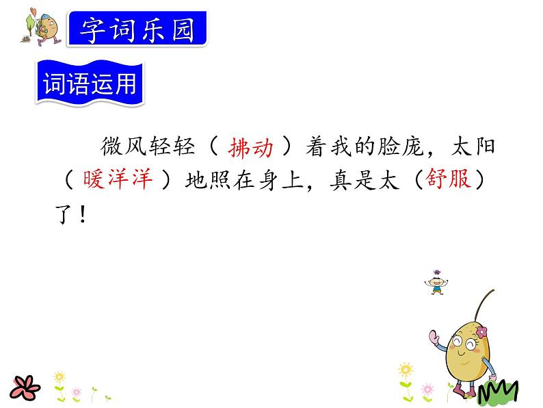 微风轻轻( )着我的脸庞,太阳( )地照在身上,真是太( )了!