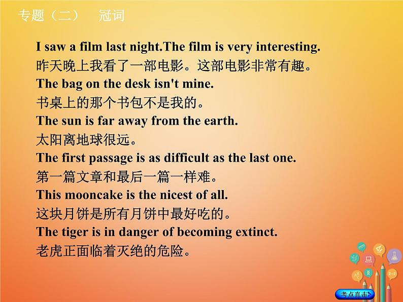 I saw a film last night.The film is very interesting.昨天晚上我看了一部电影。这部电影非常有趣。The bag n the desk isn't mine.书桌上的那个书包不是我的。The sun is far away frm the earth.太阳离地球很远。The first passage is as difficult as the last ne.第一篇文章和最后一篇一样难。This mncake is the nicest f all.这块月饼是所有月饼中最好吃的。The tiger is in danger f becming extinct.老虎正面临着灭绝的危险。