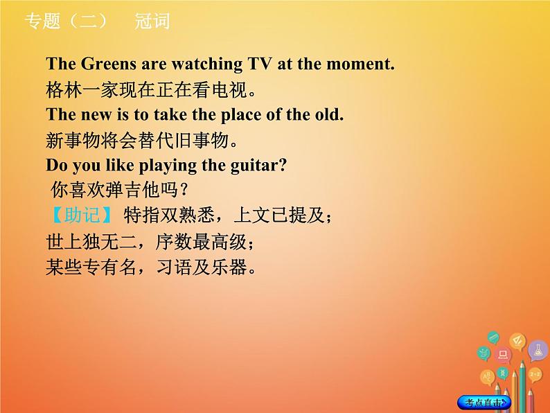 The Greens are watching TV at the mment.格林一家现在正在看电视。The new is t take the place f the ld.新事物将会替代旧事物。D yu like playing the guitar? 你喜欢弹吉他吗?【助记】 特指双熟悉,上文已提及;世上独无二,序数最高级;某些专有名,习语及乐器。
