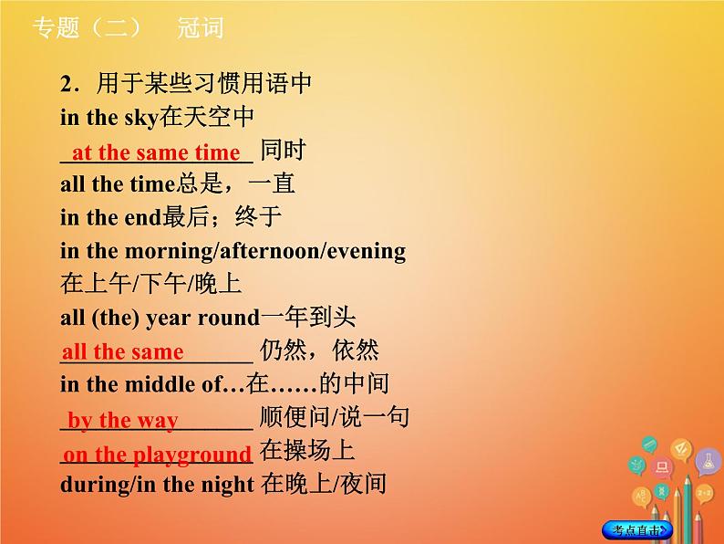 这是一份湖南省2018年中考英语总复习第二部分语法点击专题(二)冠词课件人教新目标版,共15页。PPT课件主要包含了专题二 冠词,中考考点 ,常见用法 ,by the way,go to bed ,在吃饭,by the sea,常见用法等内容,欢迎下载使用。