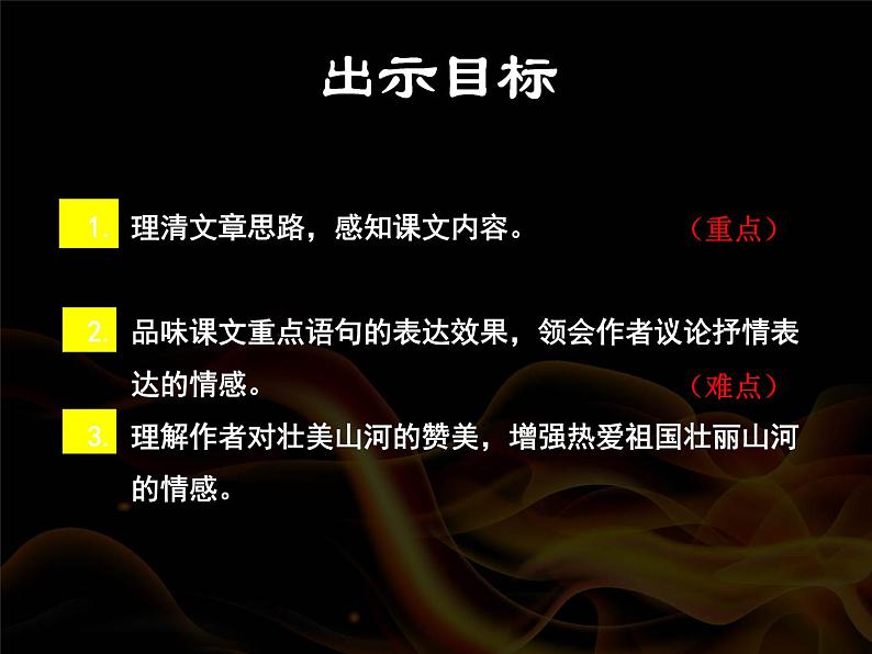 理清文章思路,感知课文内容。品味课文重点语句的表达效果,领会作者议论抒情表达的情感。理解作者对壮美山河的赞美,增强热爱祖国壮丽山河的情感。