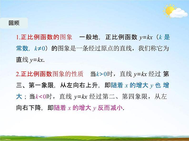 2.正比例函数图象的性质 当k>0时,直线 y=kx 经过 第三、第一象限,从左向右上升,即随着 x 的增大 y 也 增大;当k