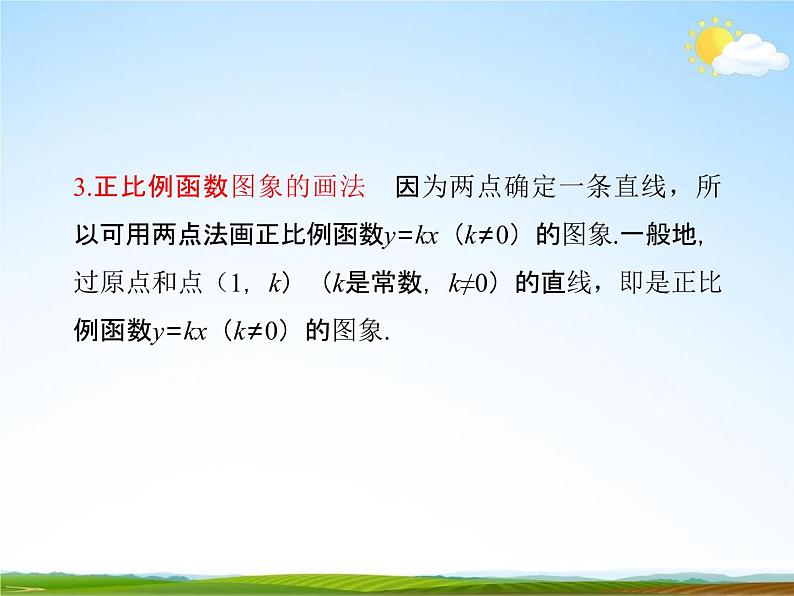 1.正比例函数的图象 一般地,正比例函数 y=kx(k 是 常数,k≠0)的图象是一条经过原点的直线,我们称它为 直线 y=kx.