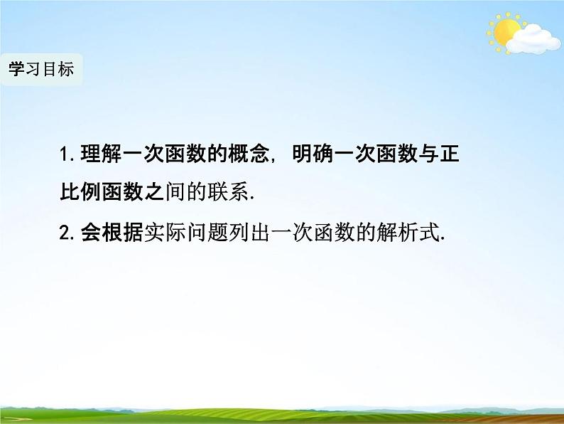 这是一份人教版八年级下册19.2.2 一次函数教学课件ppt,共27页。PPT课件主要包含了学习目标,y2x+1,一次函数,课后作业等内容,欢迎下载使用。