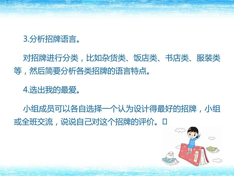3.分析招牌语言。 对招牌进行分类,比如杂货类、饭店类、书店类、服装类等,然后简要分析各类招牌的语言特点。 4.选出我的最爱。 小组成员可以各自选择一个认为设计得最好的招牌,小组或全班交流,说说自己对这个招牌的评价。
