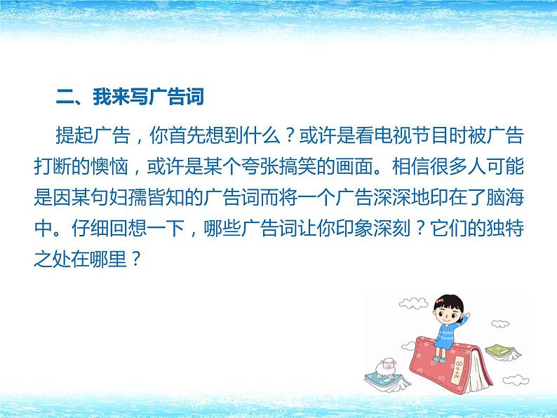 二、我来写广告词 提起广告,你首先想到什么?或许是看电视节目时被广告打断的懊恼,或许是某个夸张搞笑的画面。相信很多人可能是因某句妇孺皆知的广告词而将一个广告深深地印在了脑海中。仔细回想一下,哪些广告词让你印象深刻?它们的独特之处在哪里?